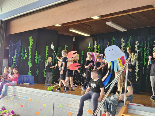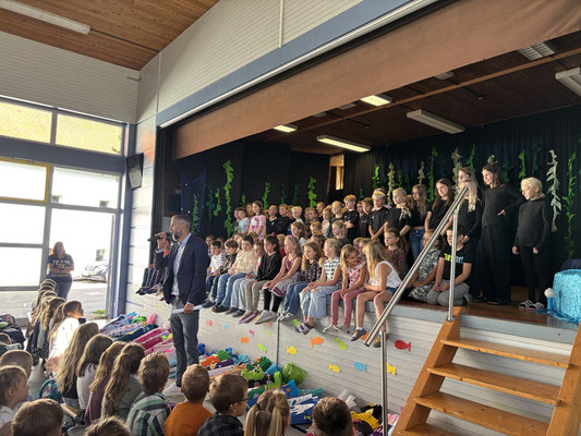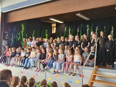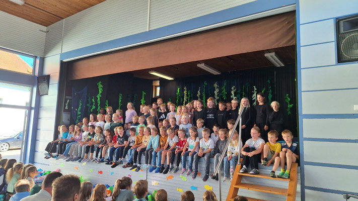 Nach einem kurzen Ortswechsel in die Turnhalle unserer Grundschule wurde die Feier dort fortgesetzt. Die Kinder der Klassen 2,3 und 4 empfingen die Neuankömmlinge mit dem Lied „A wie Anfang“. Gleich danach führten die Viertklässler das Einschulungsstück Swimmy auf. Die kleinen Zuschauer fieberten der Geschichte vom kleinen, schwarzen Fisch mit und verfolgten gespannt den Begegnungen, die er mutig im großen Meer machte. Swimmy fand schließlich seinen Platz in der Gemeinschaft anderer Fische.