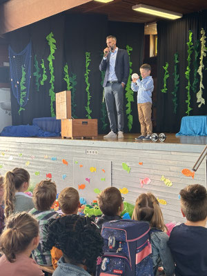 Im Anschluss trat Herr Ertmer, unser Schulleiter, auf die Bühne. Mit Unterstützung einiger Erstklässler öffnete er seine Schatzkiste und befreite daraus gute Wünsche für einen gelungenen Schulstart. Danach sangen alle Schülerinnen und Schüler der Klassen 2, 3 und 4 das fröhliche Lied „Die Schule ist wie ne große Tüte“, was für einen besonders stimmungsvollen Abschluss der Feier sorgte.